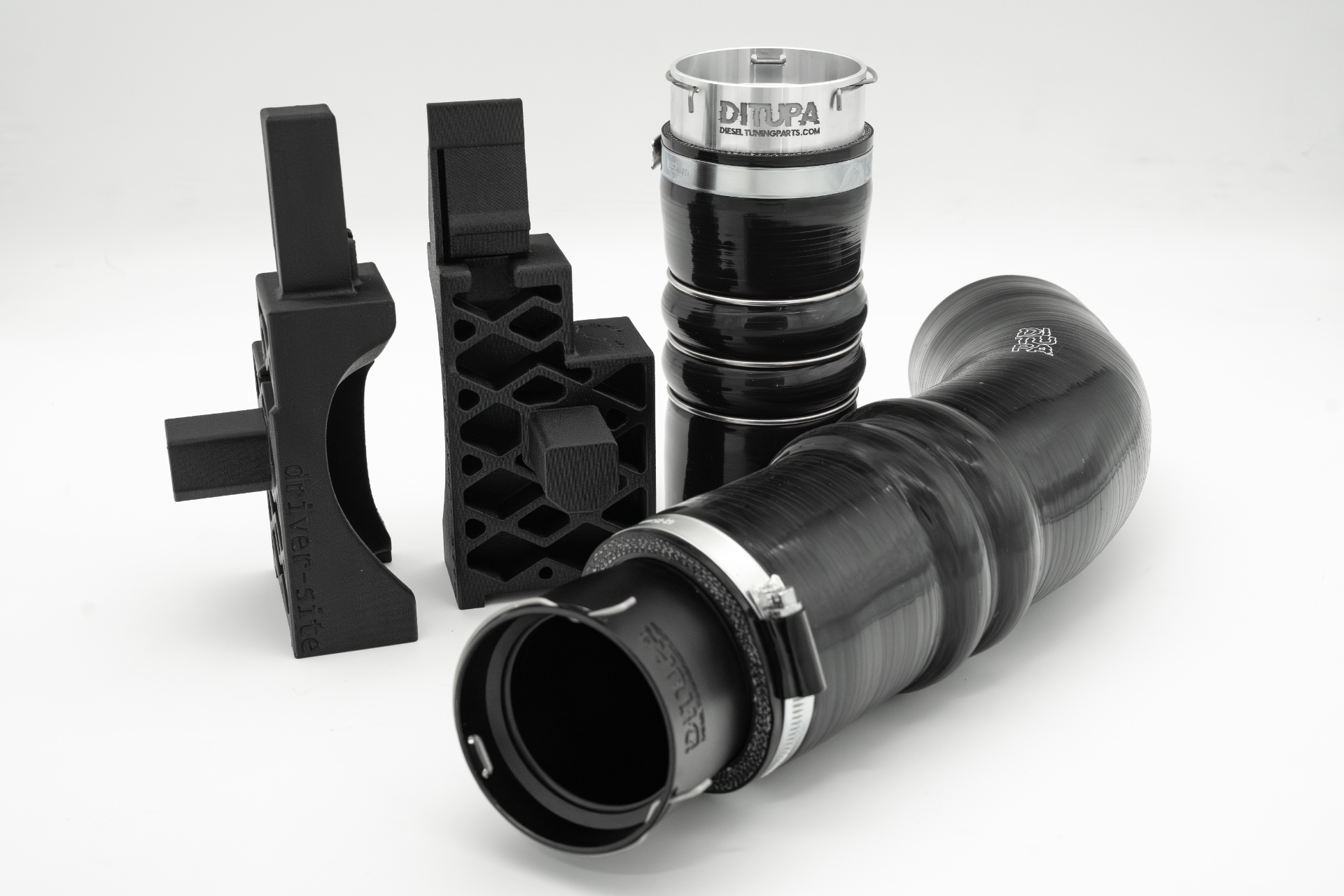 Komplettset mit beiden Ladeluftschläuchen aus 8- Lagen verstärkten Silikon und Passenden Aluminium CNC Clipanschlüsse für Drosselklappe und Laderausgang.